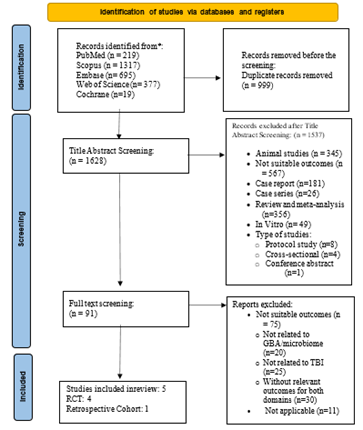 Traumatic brain injury (TBI) remains one of the foremost causes of death and long-term disability worldwide, affecting an estimated 64–74 million individuals annually with mortality ranging from 9 to 28 per 100,000 in Europe and exceeding 40 % in low- and middle-income countries [1- 3]. Beyond the primary mechanical insult, TBI triggers secondary cascades characterized by neuroinflammation, oxidative stress, blood–brain barrier (BBB) disruption, and neuronal apoptosis, which collectively impede neurological recovery [4-6]. Despite advances in surgical and pharmacologic management [4, 6], current treatments often fail to attenuate these secondary mechanisms and can introduce further complications such as infection, metabolic derangements, and electrolyte imbalance [7, 8]. Therefore, novel adjuvant strategies addressing neuroinflammation and systemic metabolic dysfunction are urgently needed. Emerging evidence highlights the gut–brain axis (GBA)—a bidirectional network linking intestinal and central nervous systems—as a critical regulator of neuro-immune homeostasis [9- 11]. The intestinal microbiota modulates immune signaling, produces neuroactive metabolites (e.g., short-chain fatty acids [SCFAs]), and influences BBB integrity [11]. Experimental TBI models reveal profound dysbiosis shortly after injury, with loss of beneficial SCFA-producing taxa and increased intestinal permeability that perpetuate systemic and CNS inflammation [12, 13]. In a clinical cross-sectional study, Yu et al. (2022) demonstrated that patients with prolonged disorders of consciousness exhibited significantly altered gut compositions and markedly reduced fecal SCFAs—acetic, propionic, and butyric acids—correlating with impaired EEG network connectivity [14]. These findings highlight the crucial role of the gut microbiome in post-traumatic neuroplasticity and recovery of consciousness. On the therapeutic side, nutritional and microbiota-targeted interventions such as early or individualized enteral nutrition (EN), glutamine supplementation, and probiotic therapy are being explored in neurocritical care [15-20]. Such interventions may preserve mucosal integrity, attenuate oxidative stress, modulate systemic immunity, and ultimately influence neurological outcomes. In parallel, micronutrient-based strategies, particularly vitamin D and E supplementation, have shown promising neuroprotective potential by mitigating neuroinflammation and oxidative stress. A recent systematic review and meta-analysis demonstrated that vitamin D supplementation significantly improved Glasgow Coma Scale (GCS) scores and functional outcomes following moderate-to-severe TBI [21]. Clinical data, albeit limited, support these mechanisms: randomized trials in severe TBI have shown that tailored or early EN protocols reduce infection rates and shorten ICU stay [22, 23], while probiotic supplementation favorably modulates inflammatory markers and adhesion molecules [24, 25]. Furthermore, Pan et al. (2025) recently developed a validated nomogram identifying predictors of EN feeding intolerance—mean arterial pressure, antibiotic use, and mechanical ventilation— emphasizing the tight interplay between gastrointestinal function and systemic recovery after TBI [26]. Collectively, these findings highlight the gut–brain–microbiota axis as a promising therapeutic target. However, clinical evidence remains fragmented, with small single-center studies and heterogeneous outcomes. This systematic review, therefore, aims to comprehensively synthesize available clinical data on gut microbiota modulation—including probiotic, prebiotic, and enteral-nutrition-based strategies—in TBI patients, assessing effects on neurological recovery, gastrointestinal tolerance, and overall prognosis. The analysis integrates quantitative meta- evaluation where feasible and narratively summarizes mechanistic insights to elucidate the translational relevance of gut-targeted therapies in TBI management.