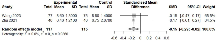 Following completion of the systematic review data extraction from all eligible studies, individual outcome domains were assessed for suitability for quantitative synthesis. Continuous neurological outcomes, including Glasgow Coma Scale (GCS) scores, and binary gastrointestinal tolerance outcomes (feeding intolerance incidence) were pre specified in the protocol as meta analysable endpoints, conditional on ≥2 randomized controlled trials (RCTs) reporting sufficient comparable data. For GCS, two RCTs ( Wang 2023 (n = 152) and Zhu 2021 (n = 80)) provided group means, standard deviations (SD), and sample sizes. For feeding intolerance, two RCTs (Zhu 2021 and Xiong 2021 (n = 133 combined)) reported incidence data as number of events over total participants per arm.