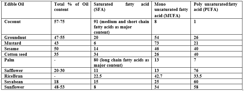 Study of general chemistry regarding constitutional analysis of lipids and fats suggests that fat containscontaining lower chain saturated fatty acids (SFA) ranging between C4-C14 present in Coconut oil alongwith substantial amounts of Mono and Poly unsaturated fatty acids (MUFA and PUFA)present in Mustard ,Groundnut (MUFA rich ) and Seasam oil (PUFA rich due to essential Linolenic ,linoleic acids) which tend to be liquid at body temperature, are absorbed relatively easily with higher rate, whereas lipids containing mostly long chain saturated fatty acids such as palmitic and stearic acids with higher melting points are digested and absorbed at slow rate. Evidences also suggests that linolenic and other ω-3 fatty acids act by somehow competing with the metabolism of arachidonic acid (20:4c∆ 9,12,15,18) the principal precursor of a class of biological regulators called Prostaglandins and Thromboxanes [1].