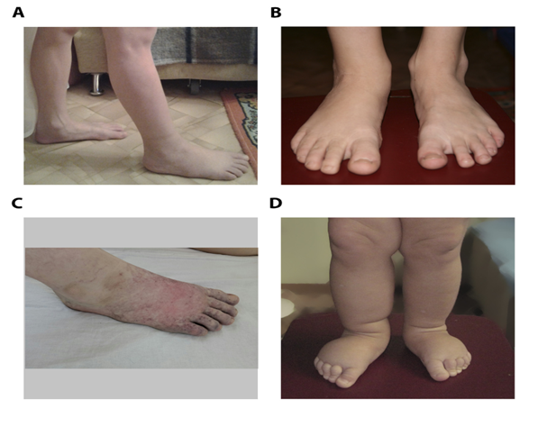 was delivered by natural vaginal childbirth as the second child of a second gravida with birth weight of 3994 g and Apgar score 8/9. Mixed CNS lesion, congenital adrenal hyperplasia and virilization was diagnosed after birth, whether her karyotype test showed no deviations. Prenatal lesions associated with lymphedema or other disorders were not discovered, edema of right lower limb was detected at 2-3 months, left lower limb edema was developed at 10 months (Figure 1D). Patient underwent treatment with CPFT 1-2 times a year with positive results from 2 years, and at the age 8 she had II stage lymphedema of both lower limbs, including foot and leg, without skin lesions.
