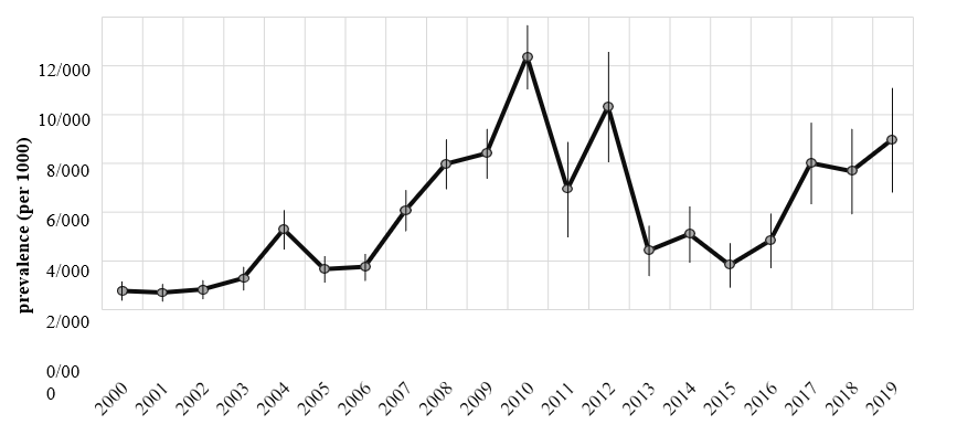Determining the prevalence of CHD trend over time may provide an insight for policymakers to develop health prevention programms. This registry-based study aimed to investigate the prevalence and time trend of CHD in the northwest of Iran over two decades between 2000 and 2019.