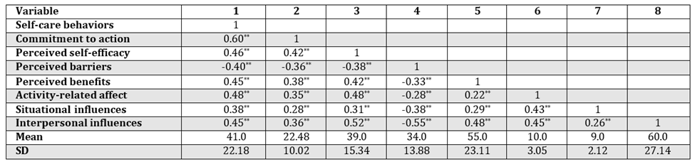 Table 1 tabulates the correlational analysis of the variables. It was shown that perceived self-efficacy (r=0.46; P<0 r=0.45; r=0.48; r=0.38; r=0.45; r=-0.40; r=0.60;>