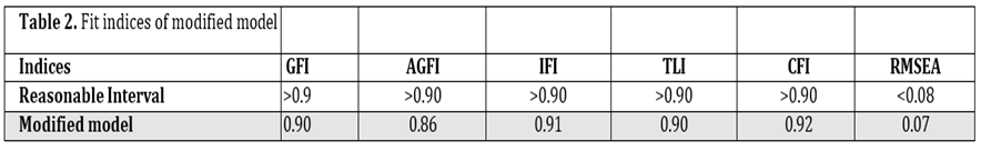 Table 2 shows fit indices in the present study. According to the obtained results, the modified model had sufficient goodness-of-fit (GFI=0.90; AGFI=0.86; IFI=0.91; TLI=0.90; CFI=0.92; RMSEA=0.07).
