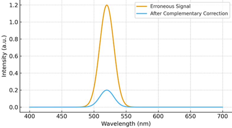Figure 4: Conceptual spectral output before and after complementary-color correction.