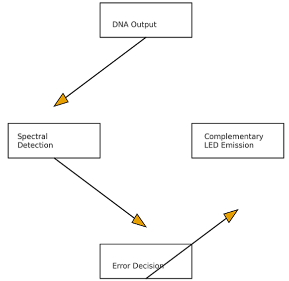 If a spectral mismatch is detected, the regulatory module emits a complementary wavelength—based on additive color theory—via micro-LEDs, quantum dots, or plasmonic resonators. Complementary emission produces destructive interference, attenuating or fully canceling the incorrect optical signal [12]. This process does not modify DNA sequences, preserving substrate reusability. The system functions as a reversible optical reset mechanism.