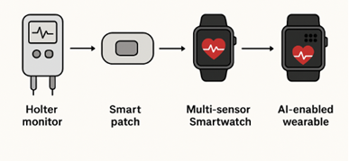 Caption: Timeline demonstrating the shift from traditional Holter monitors to smart patches, multi-sensor watches, and AI-enabled wearables. The figure highlights improvements in battery life, data resolution, and diagnostic accuracy.
