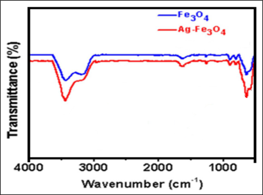 Figure 3: FTIR spectra of Fe3O4 NPs (blue) and Ag-Fe3O4 NPs (red).