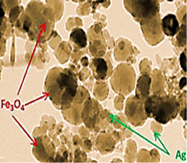 method of NPs synthesis as in our study and reported a reduced diameter from 26 to 20 nm after decorating Fe3O4 NPs with Ag. It seems that a decrease in the amount of iron-oxide precursor per unit volume of the preparation solution might be a reason for the reduced particle size in Ag-Fe3O4 NPs. However, there are reports in the literature (Tan et al., 2014) showing that the diameter of NPs increases when Ag shells decorated Fe3O4 cores. The procedure of nanoparticle synthesis has a major contribution to the characteristics of the nanocomposites including the particle size. The particle sizes measured in this study conform to the findings of Naqvi et al. (2010) study, reporting the mean size of superparamagnetic iron oxide nanoparticles as 30 nm, and the findings of Ebrahimi et al. (2016) study, producing Ag-Fe3O4 NPs in the range of 23 to 54 nm. The latter study showed that the particle size is dependent on reducing agents used in the synthesis process. Santoyo Salazar et al. (2011) conducted a study on Fe3O4 NPs in the range of 10–40 nm and showed that NPs of smaller than 20 nm had poor Fe3O4 properties.