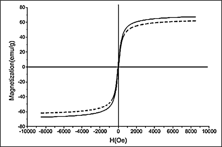 Figure 6: Magnetic hysteresis loops of Fe3O4 NPs (dashed line) and Ag-Fe3O4 NPs at 21oC.