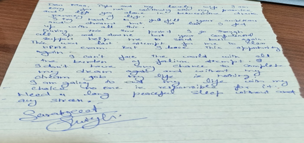 A descriptive study of a total of 10 suicide notes of those individuals who committed suicide and brought for autopsy at the mortuary of Lady Hardinge Medical College. The content of the note examined, studied and corroborated with other circumstantial evidences. Detailed information regarding the deceased and the circumstances of death was obtained using the psychological autopsy and history obtained from police and inquest papers. Photographs of scene of suicide were also evaluated. The suicide notes thus recovered were photographed using digital camera under proper day lighting. The suicide notes were read to obtain an understanding of the general content and they are analyzed.