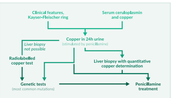 Monitoring of Treatment Monitoring should be done closely during initial treatment in all WD patients to look for efficacy (Table 4) and side effects. During the maintenance phase, patients should be checked at least twice a year. Clinical examinations include neurological, ophthalmologic, and psychiatric consultations. Patients with liver involvement need to be checked carefully for signs of liver failure. Laboratory tests include measurements of serum copper and ceruloplasmin, calculation of free (non-ceruloplasmin-bound) copper, and 24-h urinary copper excretion (Roberts 2003). While on chelating therapy, 24-hour urinary copper excretion Should initially range between 200 and 500 g; such a value can also suggest that the patient is adherent to the drug. After the removal of copper accumulation, Urinary copper excretion may be lower. The prognosis of WD is dependent on the initial severity of the disease and then on adherence to the lifelong treatment. Patients treated before severe and potentially irreversible neurological and hepatic complications have a good prognosis, approaching a normal life expectancy (Figure 6). Irreversible liver disease can often be treated. successfully by LTX, while some patients with severe neurological disease do not get better despite optimal therapy.