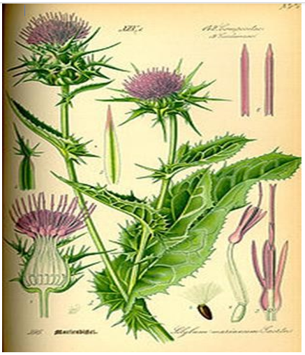 Silybum marianum belongs to family Asteraceae. Also, known as milk thistle, blessed thistle, Mediterranean milk thistle. Onopordum acanthium or Cirsium vulgare is also known as Scotch Thistle. Purple flowers, dull green leaves. 200 cm long. It is native to Mediterranean region. Found in warm wetland places. Not found in dry areas. It develops in soil pH 5.5-7.5. Can germinate in 3-4 or C.NPK Ratio 50:30:60. Phytochemical is flavonolignan silymarin.