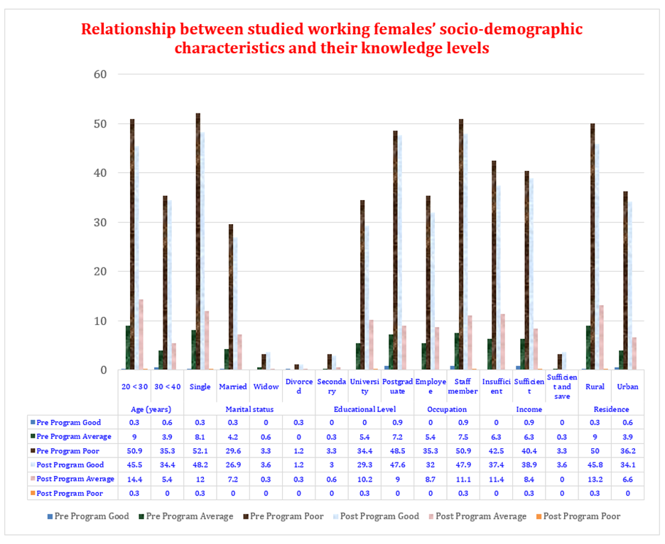 Figure (3) Illustrates the relation between studied working females’ socio-demographic characteristics and their knowledge levels through program phases. It clarifies that there is a post-program. 0.3% of studied females aged 20 to less than 30 years had a good knowledge score pre-program, which improved to 45.5% post-program. Also, 0.3% of single females had a good knowledge score pre-program, which increased to 48.2% post-program.