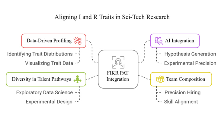 strategies [16]. Incorporating AI into Sci-Tech research further amplifies the value of these traits. For instance, those with strong I inclinations can benefit from AI-assisted hypothesis generation and data mining, while R-oriented individuals can use robotics, automation, and IoT interfaces to enhance experimental precision [17]. Through cloud-based integration of the FIKR PAT, organizations can now streamline the recruitment and development of Sci-Tech talent with a level of personalization and scalability previously unattainable.