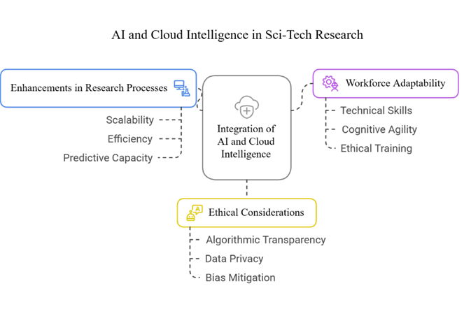 Figure 3 shows the overall idea of AI and cloud intelligence in Sci-tech research. The integration of artificial intelligence (AI) and cloud-based data intelligence into science, technology, and bio-engineering represents a transformative shift in how innovation, experimentation, and process optimization are approached [24]. While AI enhances the scalability, efficiency, and predictive capacity of scientific research and engineering processes, the effectiveness of these advancements hinges on a workforce that is not only technically skilled but also adaptable, cognitively agile, and ethically attuned [25].