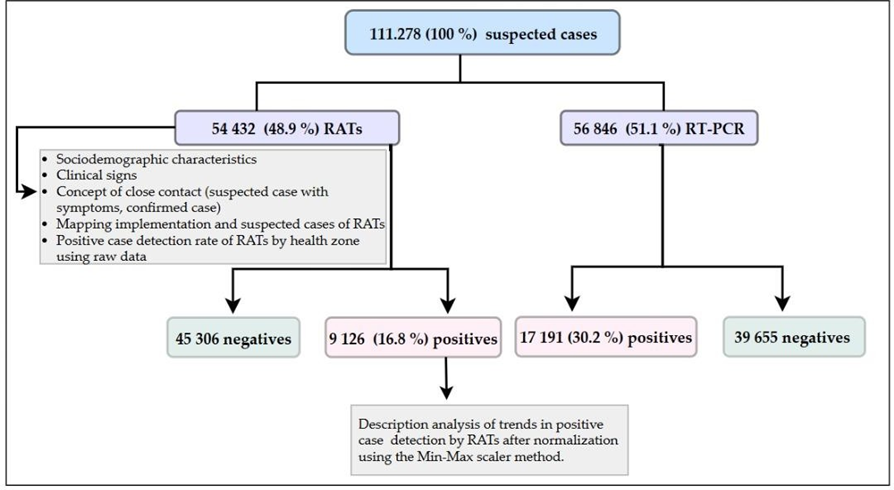 This study demonstrated broad geographical and temporal coverage of RATs in all health zones under the jurisdiction of the Kinshasa Provincial Health Department (DPS), and spanned a long period covering several successive epidemic waves. It accurately reflects not only operational practices in a health crisis context, but also the diagnostic value of taking into account symptoms and contact tracing. This makes its results extremely valuable in guiding public health policy decisions in emergency situations, with a view to breaking the chain of transmission of SARS-CoV-2 or other exponentially spreading diseases. The evaluation of the strategy of decentralizing diagnosis through the use of RATs has provided concrete data that can be transposed to other contexts facing similar difficulties in accessing RT-PCR. It thus helps to guide future testing strategies in the event of a resurgence of COVID-19 or the emergence of new respiratory threats for countries with limited resources. Author Contributions: Conceptualization: Boniface Kaputa Kabala, Steve Ahuka Mundeke and Edith Nkwembe Ngabana; Methodology: Boniface Kaputa Kabala, Daniel Mukadi Bamuleka, Julien Neze Sebakunzi, Arthur Tshimuanga Kabuamba and Edith Nkwembe Ngabana; Formal analysis: Boniface Kaputa Kabala, Julien Neze Sebakunzi, Steve Ahuka Mundeke and Edith Nkwembe Ngabana; Investigation: Boniface Kaputa Kabala, Fiston Mboma Matalampaka, Delphine Mbonga Mande, Lisa Lebo Nsimba, Youdhie Ituneme N’kaflabo, François Kahwata Mawika; Resources: Boniface Kaputa Kabala, Steve Ahuka Mundeke and Edith Nkwembe Ngabana; Writing original draft preparation: Boniface Kaputa Kabala and Edith Nkwembe Ngabana; Data curation: Boniface Kaputa Kabala and Edith Nkwembe Ngabana; Writing review & editing: Daniel Mukadi Bamuleka, Julien Neze Sebakunzi, Arthur Tshimuanga Kabuamba, Trésor Kabeya Mampuela, Jean Paul Kompany Kisenzele, Juslin Ntambwe Kaneyi, Steve Ahuka Mundeke, Edith Nkwembe Ngabana; Visualization: Boniface Kaputa Kabala; Administration of the response: Secrétariat du Comité Multisectoriel de la Riposte contre la Covid-19 and Health District Office (DPS) of Kinshasa; Supervision: Steve Ahuka Mundeke and Edith Nkwembe Ngabana. All authors have read and agreed to the published version of the manuscript.