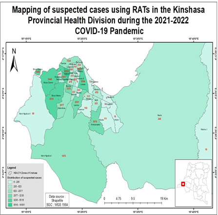 Figure 3: Mapping of the implementation and suspected cases using RATs in the Kinshasa Provincial Health Division during the 2021-2022 COVID-19 Pandemic.
