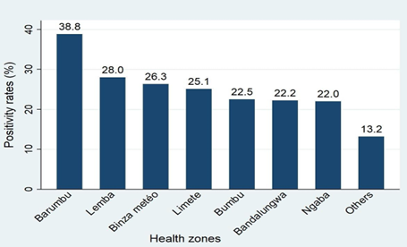 Most Health Zones in Kinshasa actively used RATs for SARS-CoV-2 screening. The RATs positivity rate considerably varied between Health Zones (Figure 3 &Figure 4). Health Zones reporting highest positivity rate were Barumbu (37.8%), Lemba (28.0%), Binza Météo (26.3%), Limete (25.1%), Bumbu (22.5%), Bandalungwa (22.2%) and Ngaba (22.0%) (Figure 4).