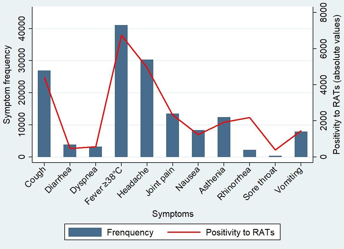 The most frequently reported symptoms among RAT-tested individuals were fever (41 079 cases), headache (30 307 cases) and cough (26 931 cases). (Figure 5). Chi-square analyses demonstrated significant between several symptoms and RAT positivity (Table 2).
