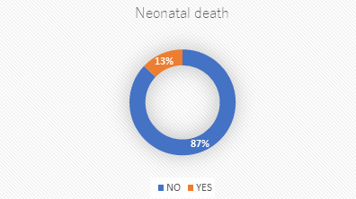 Study outcome recorded 12.96 Percentage of neonatal death amongst which all of the neonatal death concerned the newborns admitted at the intensive care unit, either 77.78 Percentage of the admissions.