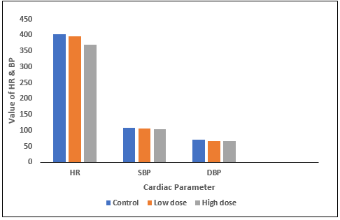 Table 2: Table 2 shows the heart rate, systolic and diastolic blood pressure of low dose groups.