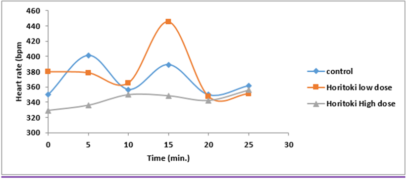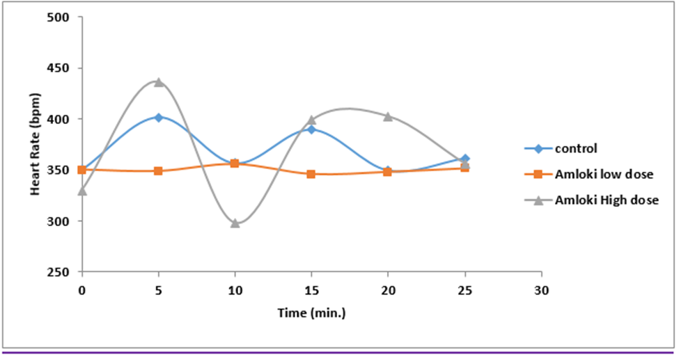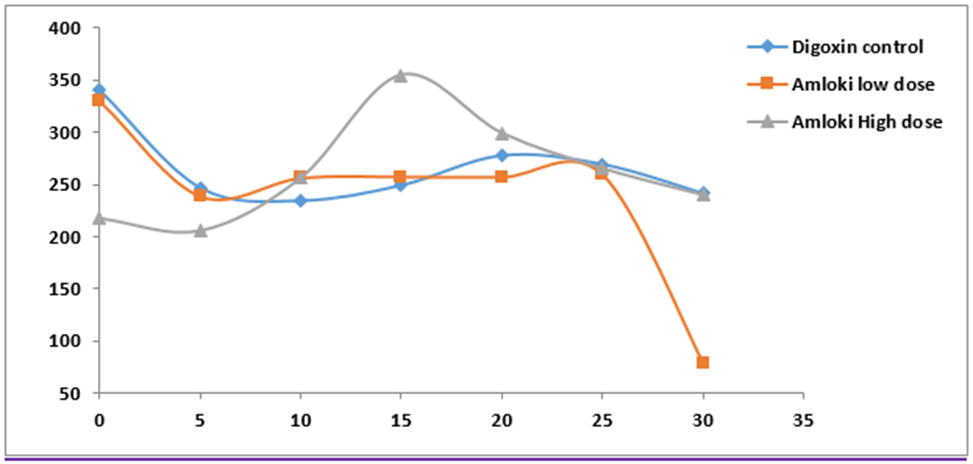 We assessed the ECG results of control groups, low dose group and high dose groups treated with Amlaki extract to the prementioned dose. This experiment was done in two distinct protocols. In one protocol the heart rate of the rats were measured without digoxin treatment while other protocol measured HR after digoxin treatment. No significant (P>0.05) change was obtained in heart rate after chronic pretreatment with Amalaki in comparison to the untreated group. In addition, there were also no significant changes in heart rate in the RR interval of ECG. We conducted same experiment in case of haritaki and the results were similar to the Amaloki.