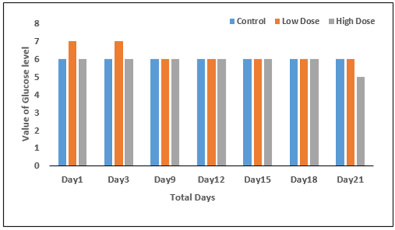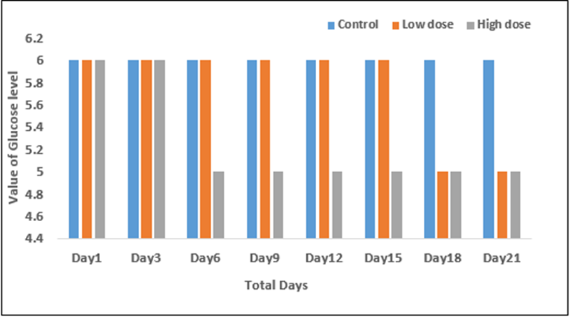 The control group, low–dose and high–dose group of rats were fed normal diet for 21 days and the glucose lowering activity of amlaki was measured by checking blood glucose after every 3–day interval.