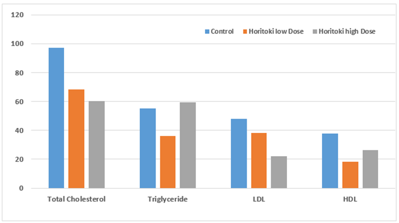 Amlaki was administered to the predetermined dose to the three distinct groups. Serum total cholesterol, triglyceride, high density lipoprotein-cholesterol and low-density protein-cholesterol were analyzed by using spectrometric assay. Significant decrease in cholesterol and LDL was also found after Amlaki treatment for both high and low dose of the plant (p<0.05) compared to the untreated groups. However, it did not have any notable effects on HDL and triglyceride level when compared with the untreated groups. In case of Haritaki, similar results were found as Amalaki which confer the LDL and cholesterol lowering activity of haritaki and have no significant activity in case of HDL and triglycerides. In agreement with our study, similar results were found in case of LDL and cholesterol while some plants have LDL, cholesterol and triglyceride lowering activity and HDL increasing capacity like Hypericum lysimachioides, Azadirachta indica leaf extract, Rosmarinus officinalis leaves powder, Terminalia Arjuna. [29-32]