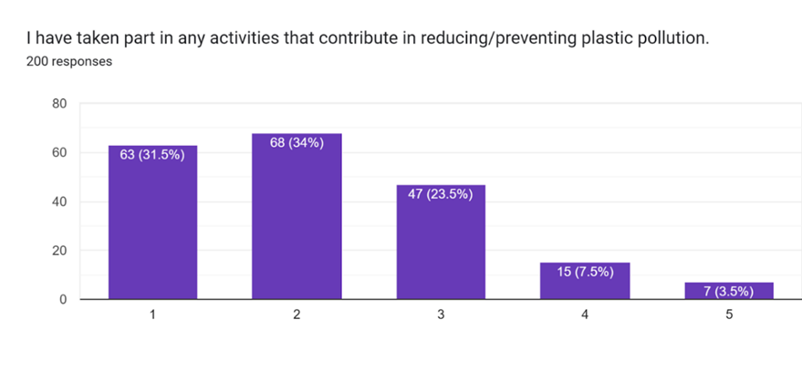 Most respondents have taken part in any sort of activities that can contribute in plastic pollution reduction and prevention which a total of 178 respondents actively have taken part or responsibility.