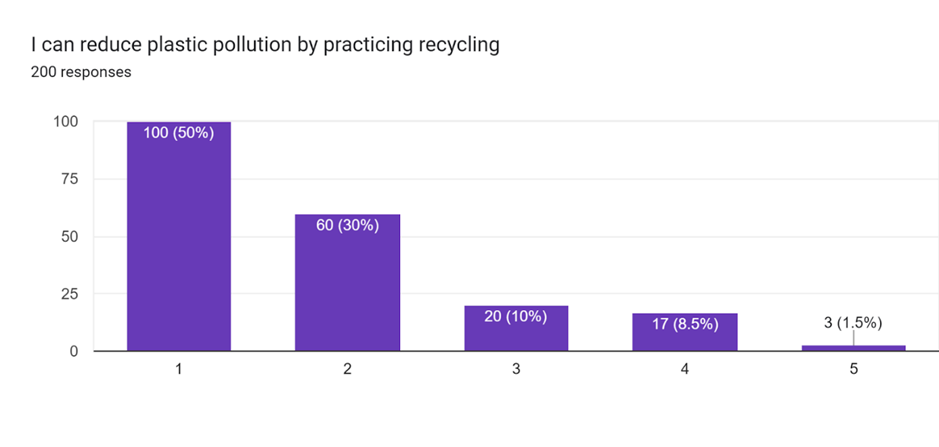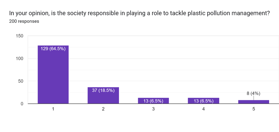 More than half of respondents strongly agree with the statement that society is responsible for playing a role in resolving plastic pollution because it had 129 votes while 8 respondents strongly disagreed.
