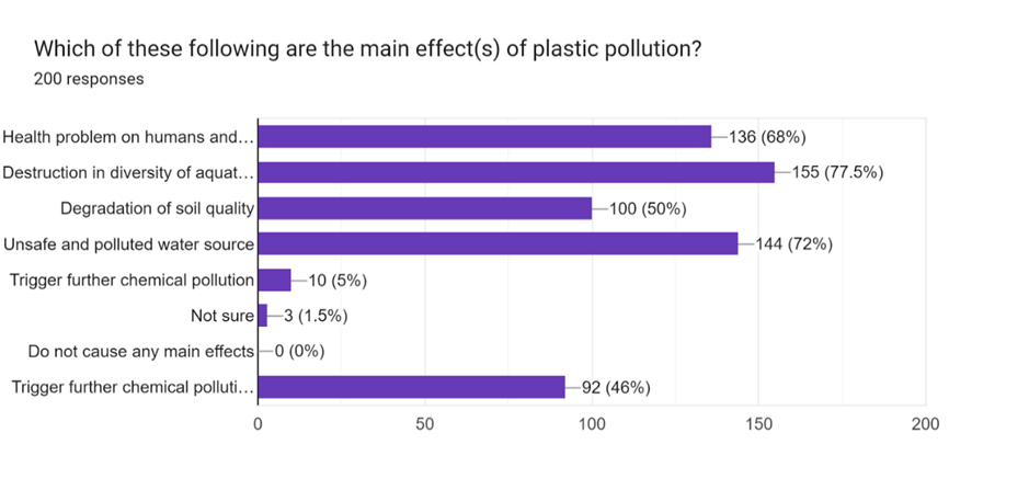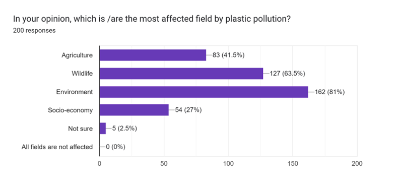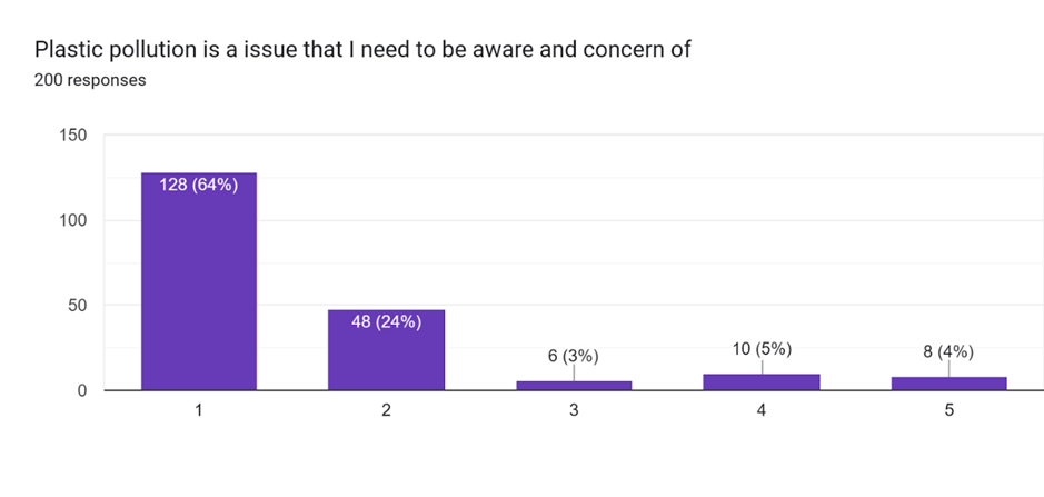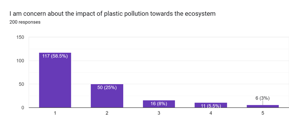 Most respondents are concerned about the impact of plastic pollution towards the ecosystem which it can harm our wildlife and natural habitat and also accumulation of microplastic in the soil and water because plastic is non-biodegradable.