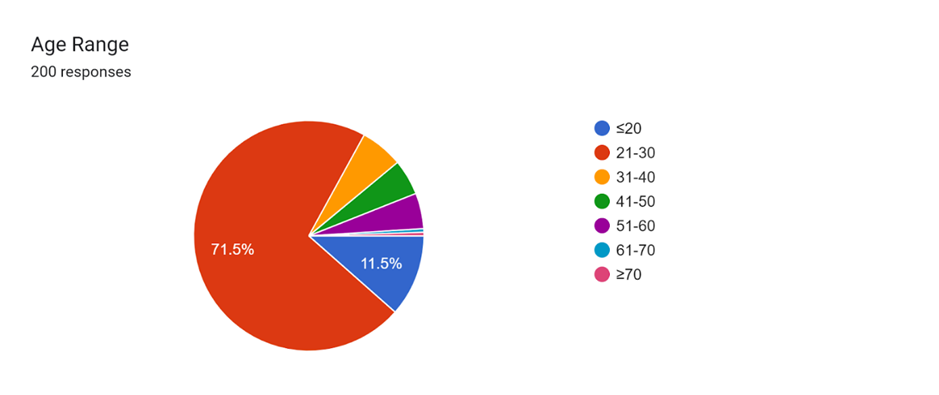 From the 200 respondents, the highest percentage of respondents is from the age range of 21 to 30 years old. The lowest percentage of respondents are from the age group of 61 to 70 and above 70 years of age.