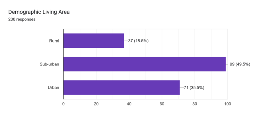 Most of the respondents live in sub-urban areas with people living in the less populated area with 49.5% overall while 35.5% of the respondents living in the urban area.