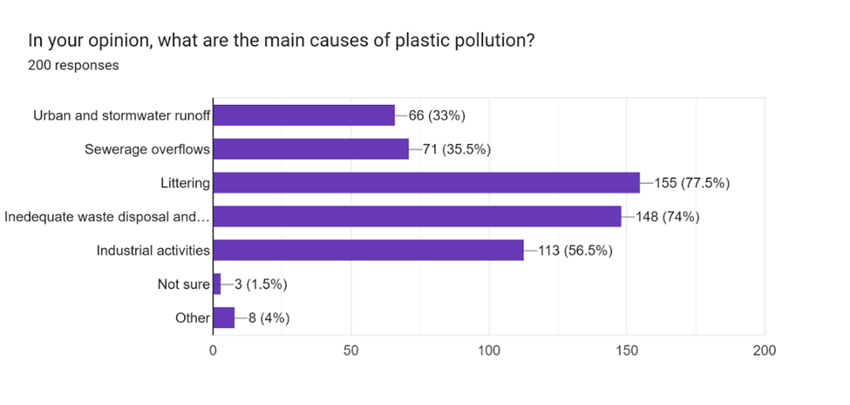 Most of the respondents agree that littering is the main cause of water pollution since it has the highest percentage of 77.5%. Industrial activities like manufacturing and packaging production where the plastic is generated got 113 votes.