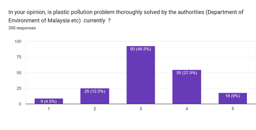 Next, the majority of the respondents solely agree that plastic pollution rose due to an increase in population and industrial activities. The response can be attributed to a report by Masseran et al. (2023)) where he reported that the rise of industrial activities in Port Klang had caused the rise in waste products produced in the area. Due to these factors, most respondents believe that society needs to play a vital role in tackling plastic pollution, and 129 respondents strongly agree with the suggestions. Due to the ineffectiveness in tackling the problem, most of the respondents have doubts about whether Malaysia will be able to tackle the problems. This shows that drastic action needs to be taken to restore public trust in our local government's ability to ensure the problem can be solved thoroughly.