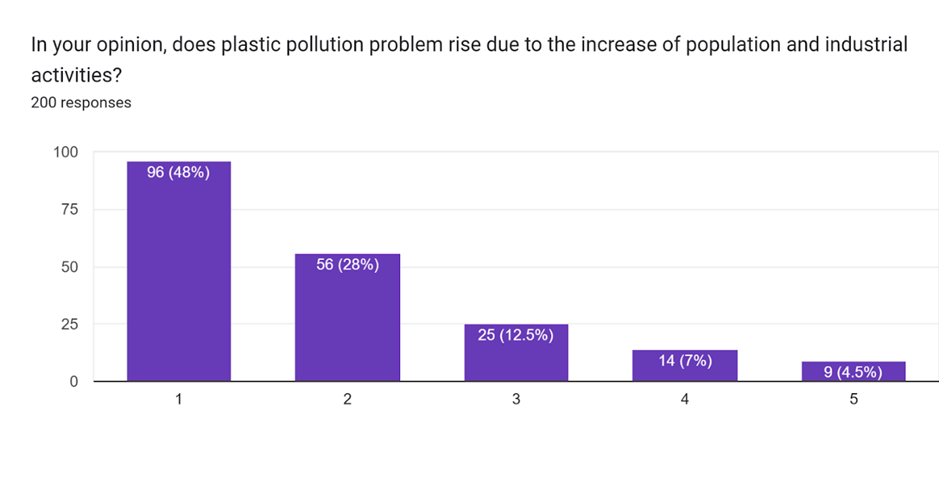 A total of 96 respondents strongly agreed that plastic pollution in Malaysia rises due to the increase of population and industrial activities since the demands for plastic are also increasing.