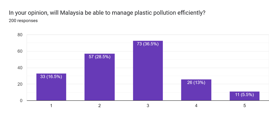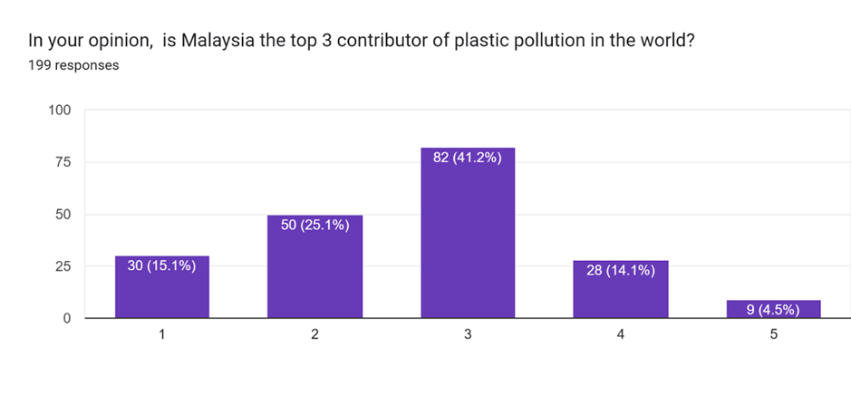 Most of the respondents agreed that Malaysia is the top 3 contributor of plastic pollution in the world but typically Malaysia is not the top 3 ranking because the primary contributor is the country with larger population and less developed waste management.