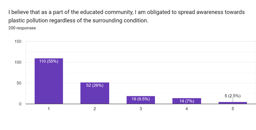 A total of 110 respondents believed that they were obligated to spread awareness about the plastic pollution issue in the community of Malaysia regardless surrounding backlash or condition.
