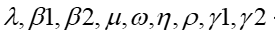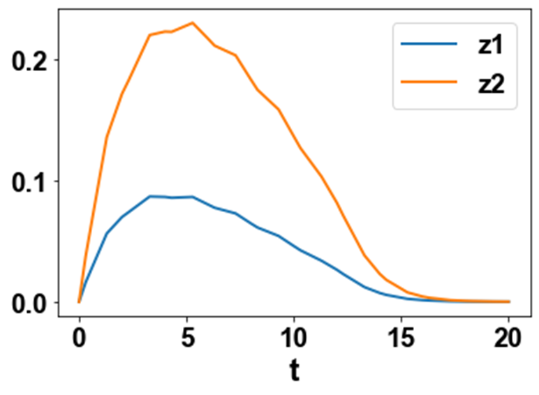take on values 0.1, 0.1,0.1, 0.03622, 0.1, 6, 0.3, 0.01, 0.1, and stand for the constant birth rate within the human population, the transmission rate of strain one, the transmission rate of strain two, the death rate of the human population, the rate of mutation of the virus from strain one to strain two, the incubation time of respiratory syncytial virus, the probability that strain one will infect a new case, the rate at which individuals infected with strain one recover, the rate at which individuals infected with strain two recover.