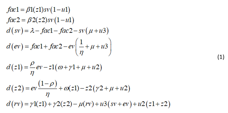 The variables sv, ev, z1, z2, rv represent susceptible, exposed, acutely infected, chronically infected, and recovered populations. The control and bifurcation parameters u1, u2, and u3 represent the isolation of infected individuals, the treatment of infected individuals, and the vaccination of susceptible individuals. The parameters