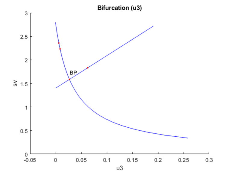 The MATLAB software MATCONT is used to perform the bifurcation calculations. Bifurcation analysis deals with multiple steady-states and limit cycles. Multiple steady states occur because of the existence of branch and limit points. Hopf bifurcation points cause limit cycles. A commonly used MATLAB program that locates limit points, branch points, and Hopf bifurcation points is MATCONT (Dhooge, Govaerts, and Kuznetsov, 2003[11]; Dhooge, Govaerts, Kuznetsov, Mestrom and Riet, 2004[12]). This program detects Limit points (LP), branch points (BP), and Hopf bifurcation points(H) for an ODE system.