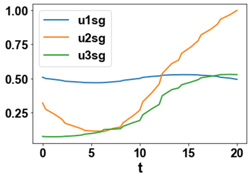 The MNLMPC values of the control variables, u1, u2, and u3 were 0.4992, 0.32099, and 0.06119. The MNLMPC profiles are shown in Figs 2a-2d. The control profiles of u1, u2, and u3 exhibited noise (Fig. 2c) and this was remedied using the Savitzky-Golay filter to produce the smooth profiles u1sg, u2sg, and u3sg (Fig. 2d). The presence of the branch points causes the MNLMPC calculations to attain the Utopia solution, validating the analysis of Sridhar (2024) [20].