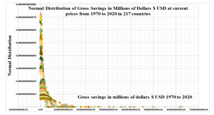 Фμ,σ^2 (x)= ∫_(-∞)^x▒φ μ,σ^2 (u)du=1/(σ√(2 π )) ∫_(-∞)^x▒〖 e〗⎺.^(((u-μ)^2)/(2σ^2)) du,x∈R shows us that savings have positive asymmetry from 1970 to 2020 in 217 countries.