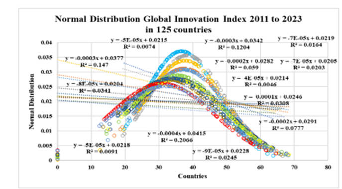 Фμ,σ^2 (x)= ∫_(-∞)^x▒φ μ,σ^2 (u)du=1/(σ√(2 π )) ∫_(-∞)^x▒〖 e〗⎺.^(((u-μ)^2)/(2σ^2)) du,x∈R [2] shows us that Innovation in 125 countries has positive asymmetry from 2011 to 2023.