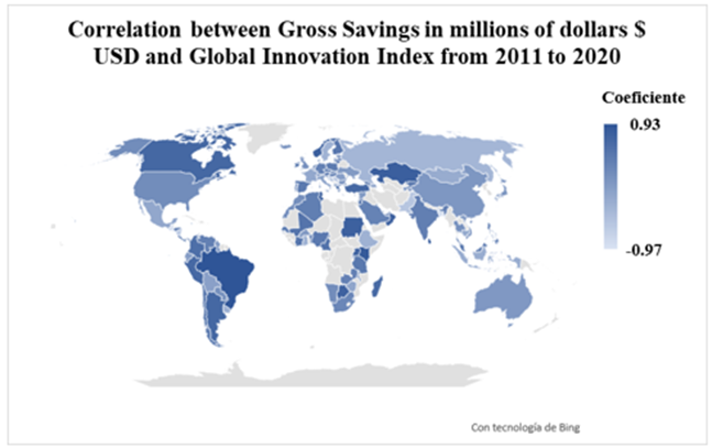 Figure 4: Correlation map by country between gross savings in millions of dollars $ USD and Global Innovation Index from 2011 to 2020