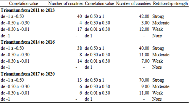 The correlation was calculated in trienniums 2011-12013; 2014-2016 and 2017 to 2020, the results in table 1 show us that the countries have improved the relationship between savings and innovation in the four-year period from 2017 to 2020: