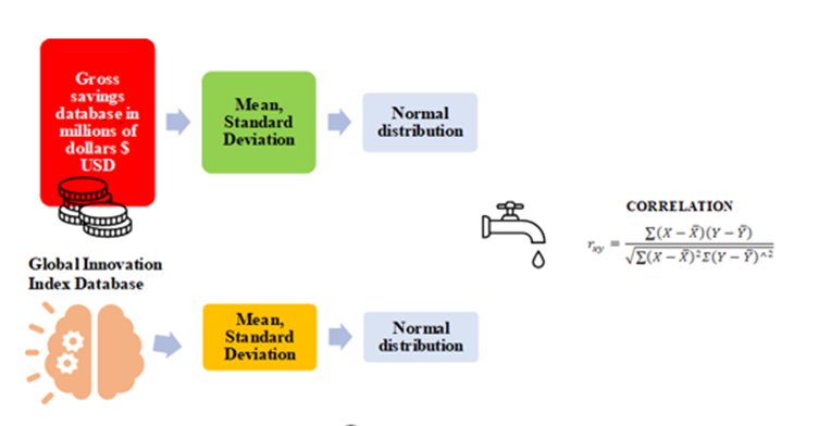 The research is empirical in nature, due to its depth it is correlational, its inference is hypothetical. The variables databases are quantitative, and the temporality is longitudinal or diachronic. The general objective was to establish the relationship between gross savings and the global innovation index, and the specific objective was to graph the shape of the variables with descriptive statistics. The hypothesis was that savings have a strong correlation with innovation and creativity. The population of the databases is 217 countries (includes islands and administrative zones), A representative sample for this population by the "Sturges rule" K=1+3.3(log n) would be: 8 countries (Sturges, 1926). In the normal distribution of the Gross Savings of 217 countries (includes islands and administrative zones), for the normal distribution of the Global Innovation Index a sample of 125 countries was taken. 125 countries were included in the correlation analysis.