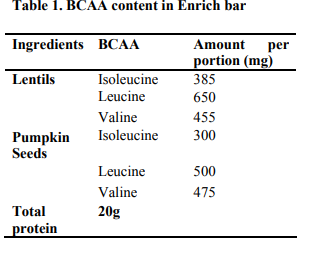 The BCAA in the enriched bar was estimated using the USDA Food Composition table and the results are presented in Table 1.The information is represented for 100 grams of the bar. Lentils and pumpkin seeds show high BCAA content as compared to other sources; isoleucine 385mg, leucine 650mg,445mg in lentils. The BCAA breakdown of pumpkin seeds was; isoleucine 300mg, leucine 500mg and valine 475 mg.