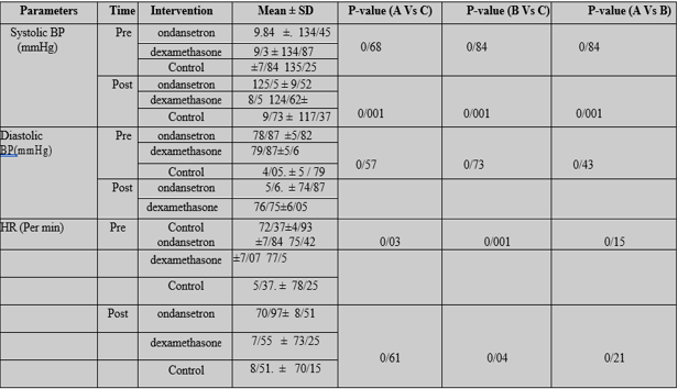 average blood pressure in the two intervention groups is higher than the control group. The P-value ondansetron and dexamethasone versus control was 0.001 in terms of Systolic blood pressure. The P-value ondansetron versus control was 0.03 and 0.001 for dexamethasone versus control regarding Diastolic blood pressure. In general, the average heart rate did not show significant changes except in the comparison of dexamethasone versus control which showed that heart rate significantly decreased in the control group. (P-value=0.04)
