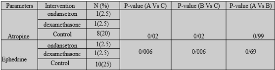 Based on the information in Table 4, the number of atropine and ephedrine prescriptions was compared between the intervention and control groups and it was observed that the dexamethasone and ondansetron group differed significantly from the control group in terms of ephedrine and atropine prescription. So the prescription of ephedrine in the control group was higher than in the two groups with drug intervention. Also, the results showed that the two groups of ondansetron and dexamethasone had no significant difference from the point of view of prescribing ephedrine or atropine.